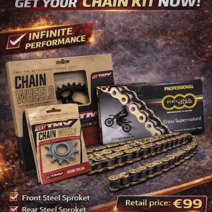 Goed nieuws voor iedere crossmotorliefhebber: wij hebben een complete set bestaande uit een ketting, voor en achtertandwiel voor maar €
