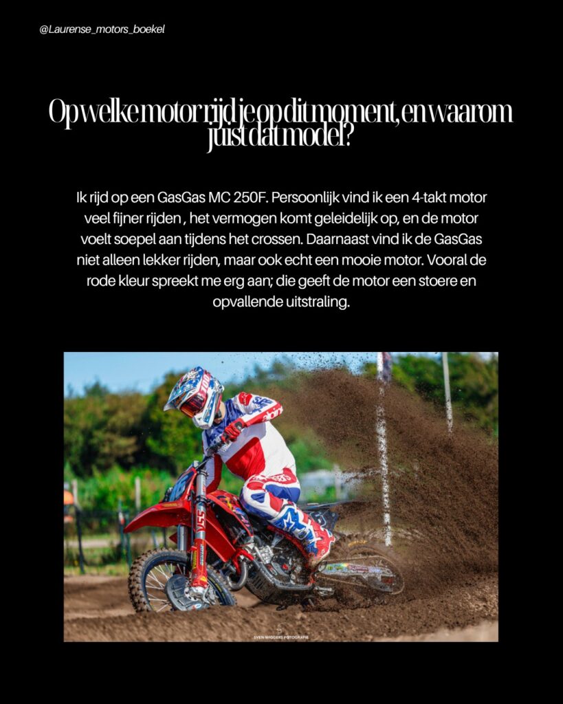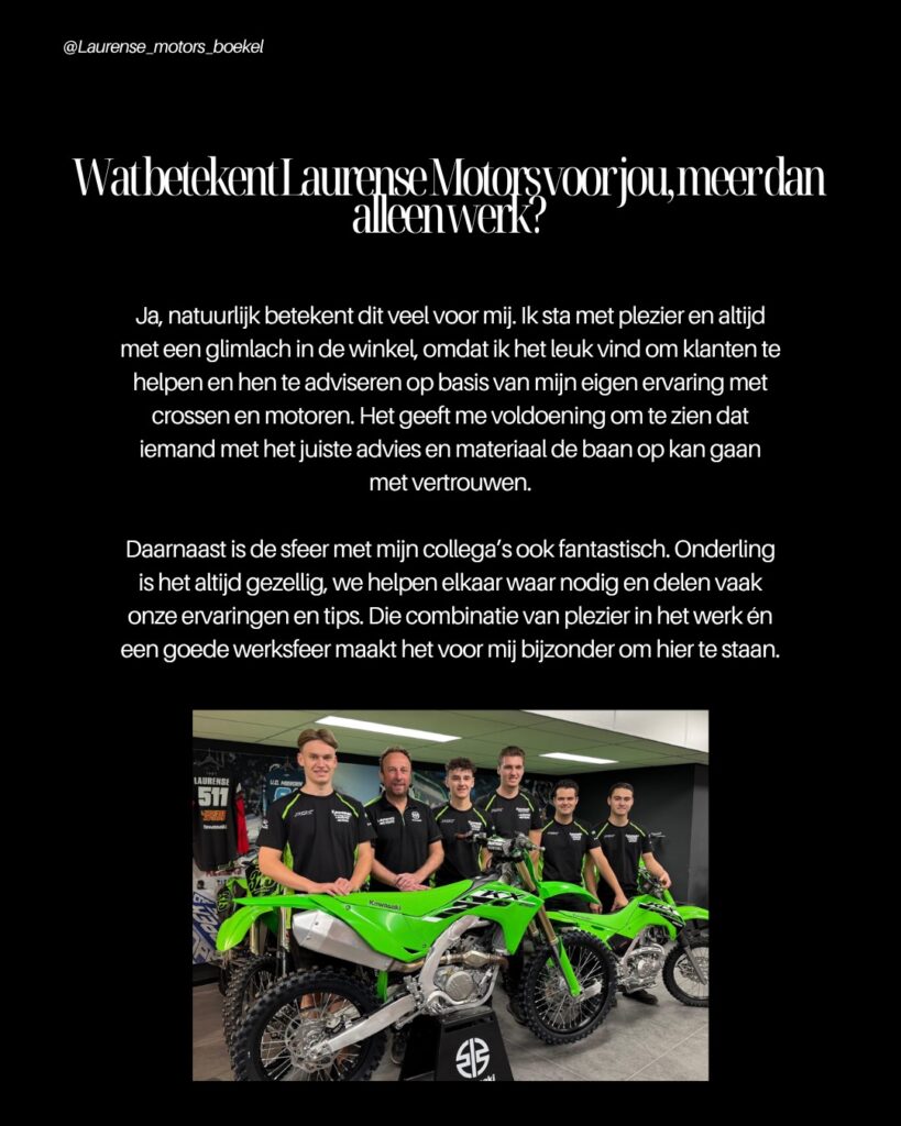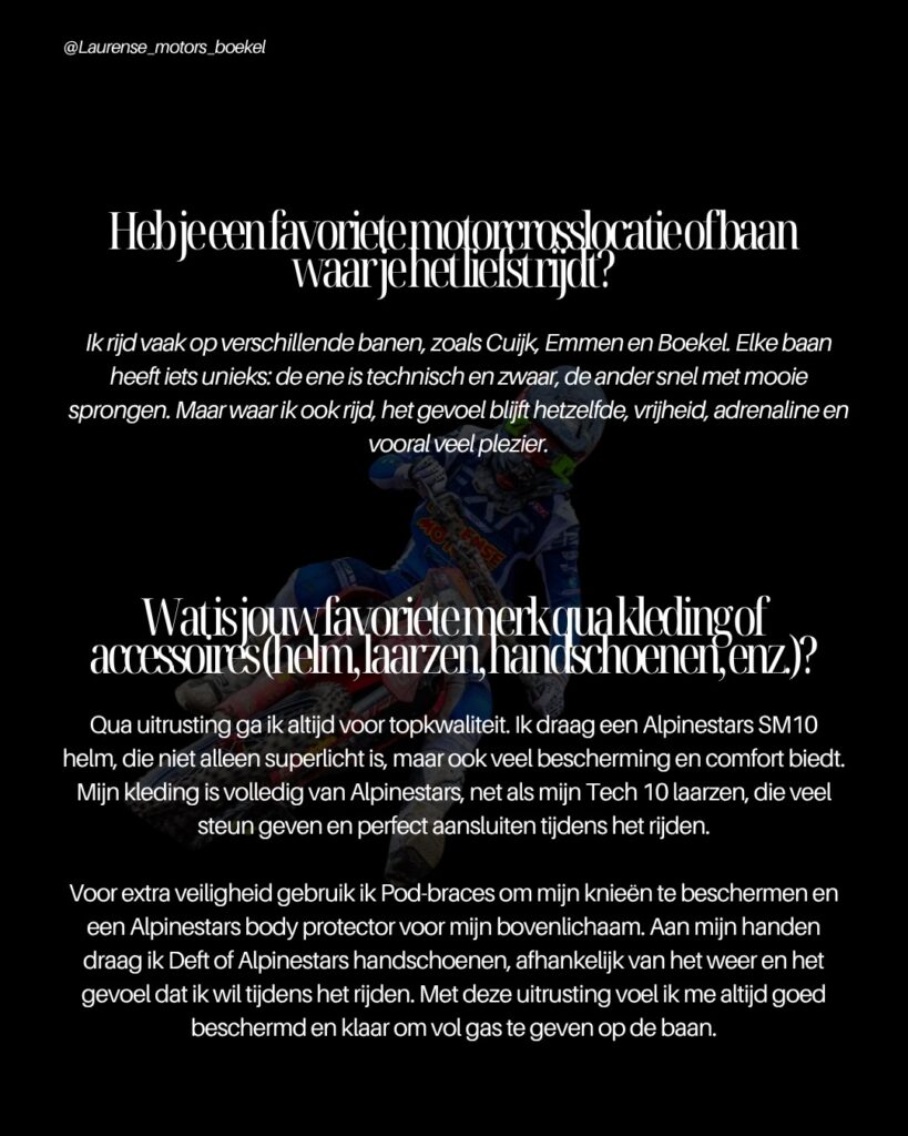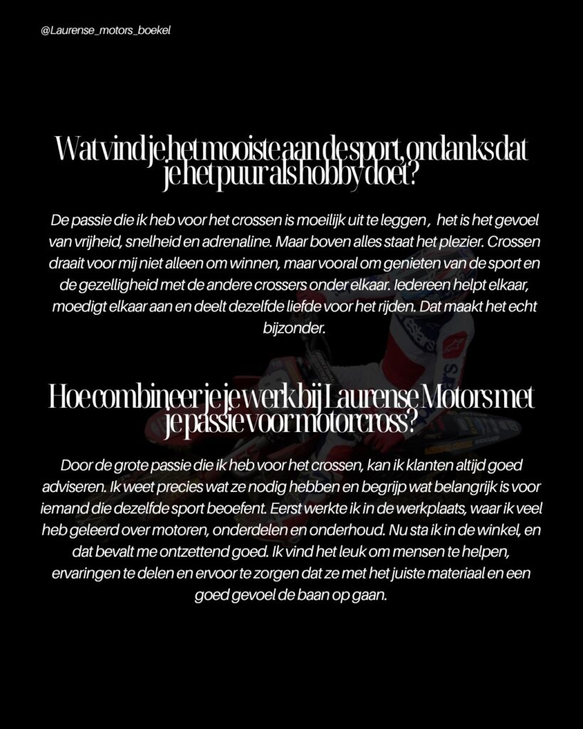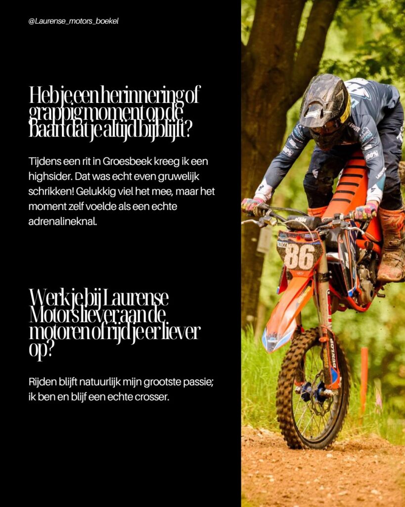 Van een high sider in Groesbeek tot dagelijks klanten adviseren over hun motor, kleding en protectie, Daan (Donny) doet het allemaal met een glimlach. Hij vertelt over hoe zijn oom hem aanstak met het crossvirus, waarom hij liever 4-takt rijdt en wat het werken bij Laurense Motors voor hem betekent. “Crossen blijft voor mij plezier op 1. En dat gevoel neem ik mee de winkel in.” Benieuwd naar zijn favoriete baan, gear en het merk dat hij voor altijd zou kiezen? 👀